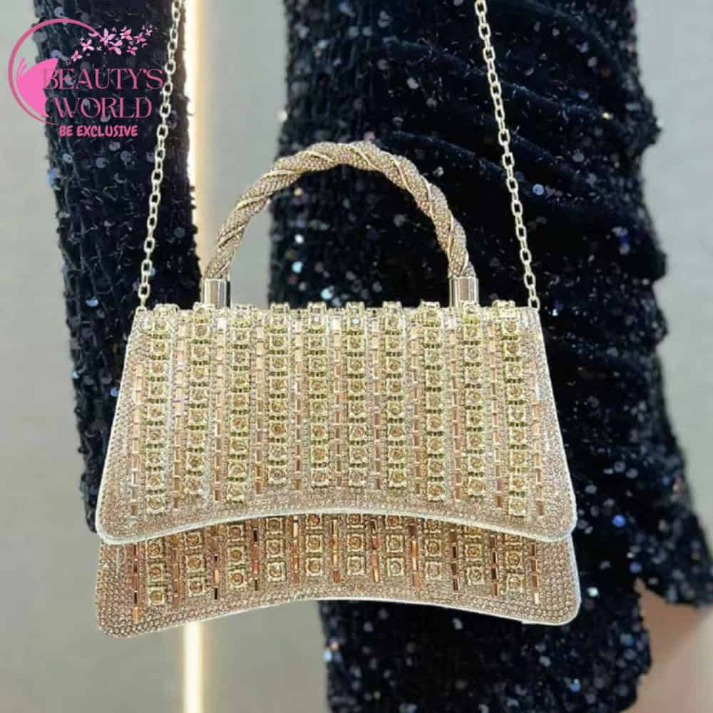 The Fashionable Full Diamond Clutch Gold Color is a stunning accessory designed to add a touch of glamour to your ensemble. Adorned with shimmering rhinestones, this clutch is perfect for special occasions where you want to make a statement.