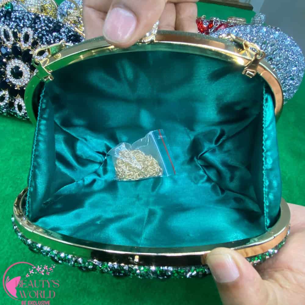 The Oval sunflower Party Clutch  is a premium clutch designed for elegance and durability. Imported directly from China, this bag features Artificial stones that are securely embedded, ensuring long-lasting sparkle without color fading. Its eye-catching oval sunflower design is complemented by a long chain, offering versatility for various occasions.​